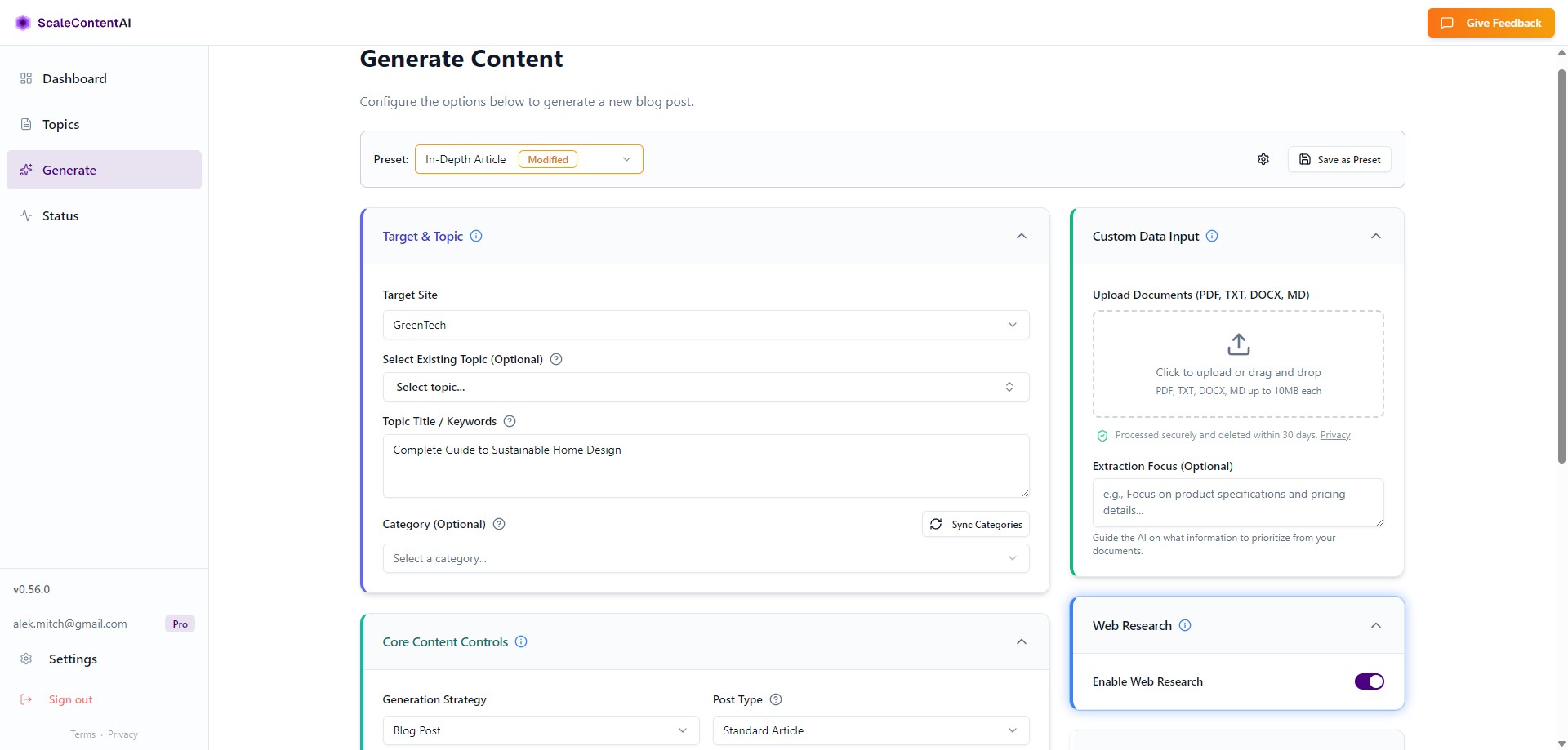 Upload PDFs, text files, or documents. The AI synthesizes your source material into the article — not just web-scraped generic content.